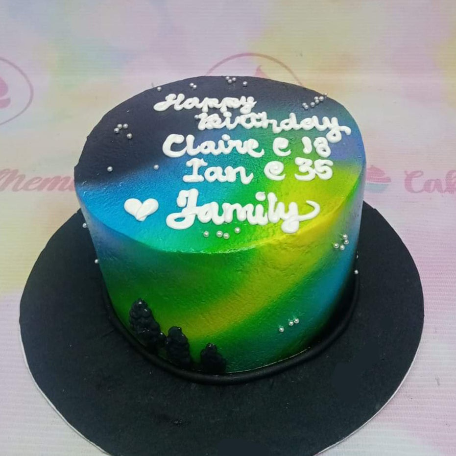 Aurora Borealis themed birthday cake with a gradient of blue, green, and purple icing, silver dragees, and white icing text.