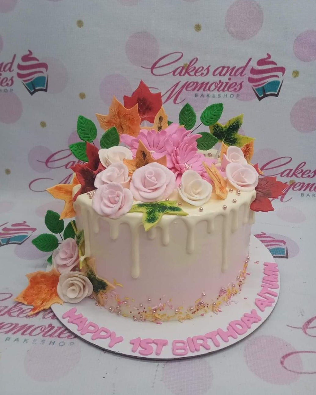 Pink and white gradient birthday cake with a white chocolate drip, pink and white roses, and autumn leaves.