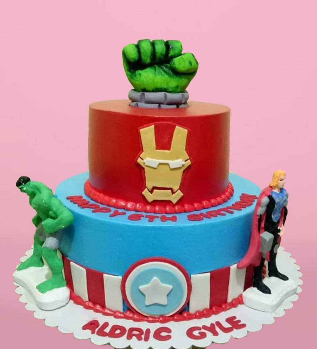 Two-tier Avengers themed cake featuring Hulk's fist, Iron Man's mask, Thor, and Captain America shield designs in red and blue.