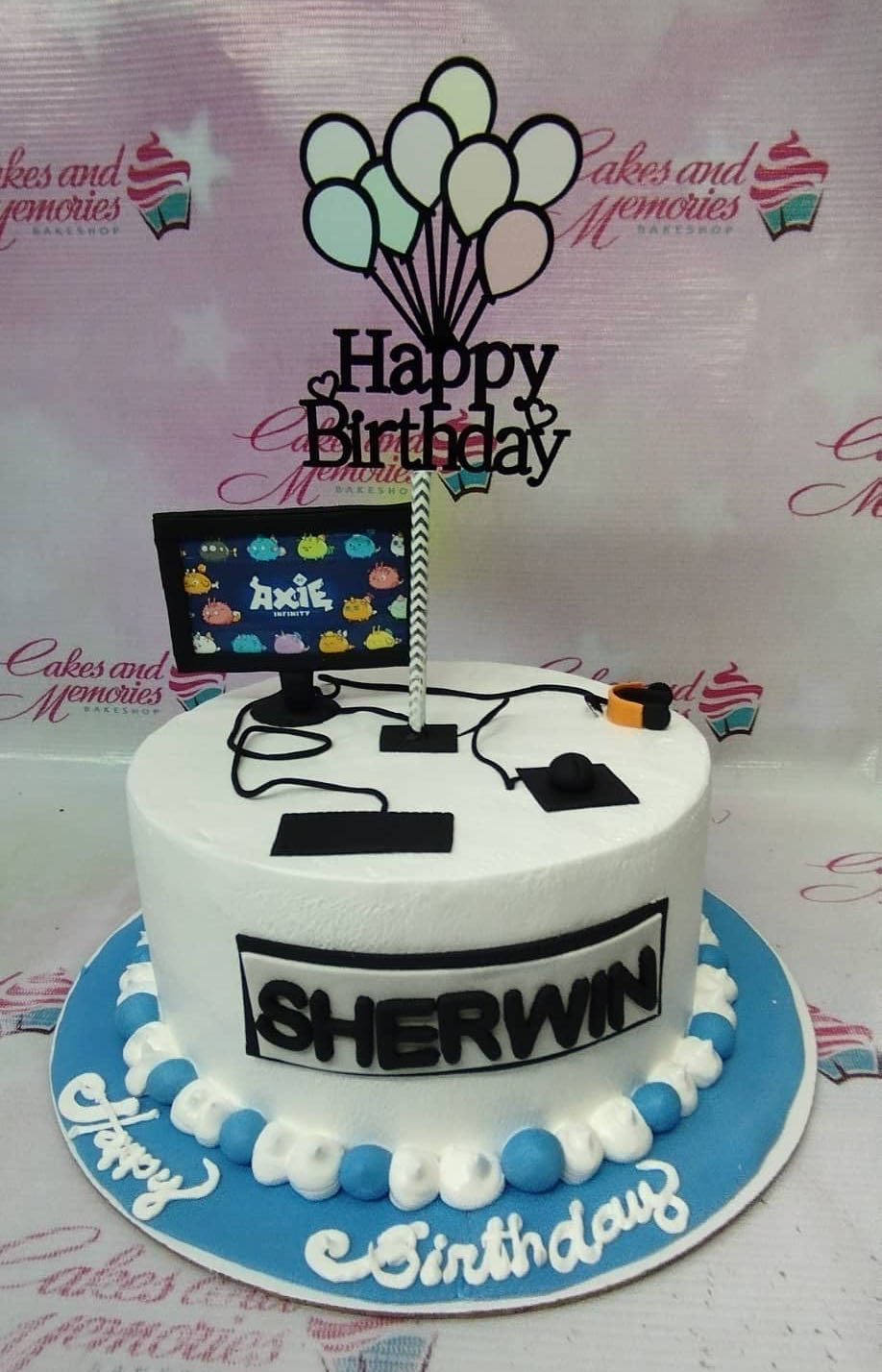 White gaming themed cake with Axie Infinity monitor printout, fondant keyboard, mouse, and headset toppers with a balloon birthday topper.