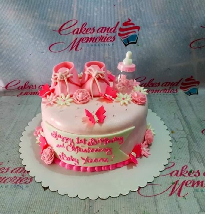 Pink baby girl christening cake with fondant baby shoes, a baby bottle, and pink butterflies on a light pink fondant base.