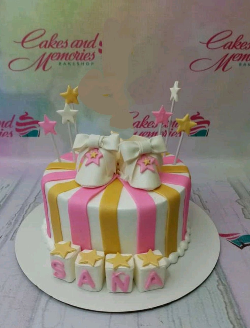 White fondant cake with pink and gold vertical stripes, topped with white baby shoes and star toppers.