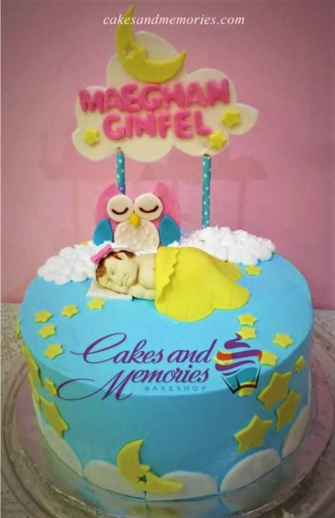 Light blue baby shower cake with a sleeping baby fondant figure, pink owl, and yellow moon and stars decorations.