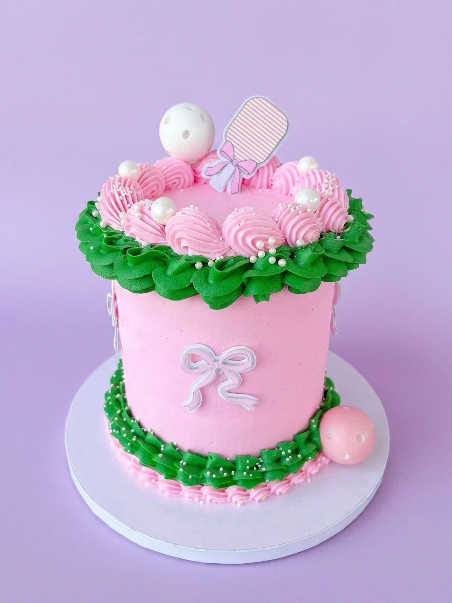 Tall pink cake with green and pink icing ruffles, white pearls, and a pink striped rattle printout topper.