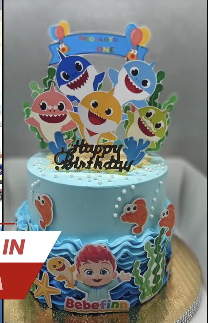 Baby Shark Bebefinn 1 Tier - orange, green, yellow theme with Baby Shark family group and orange fish