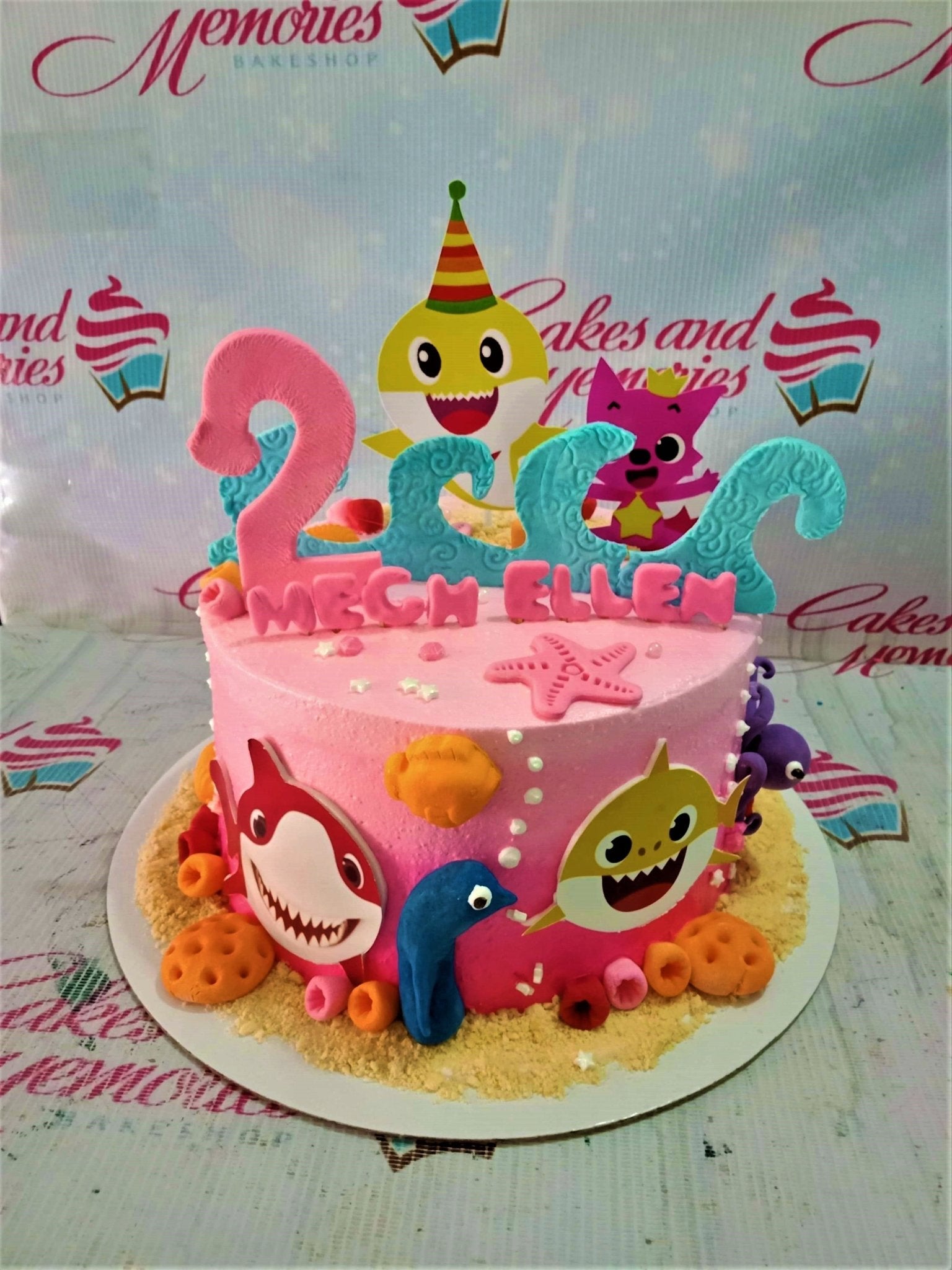 Pink Baby Shark themed birthday cake with fondant sea creatures, waves, and character printouts.