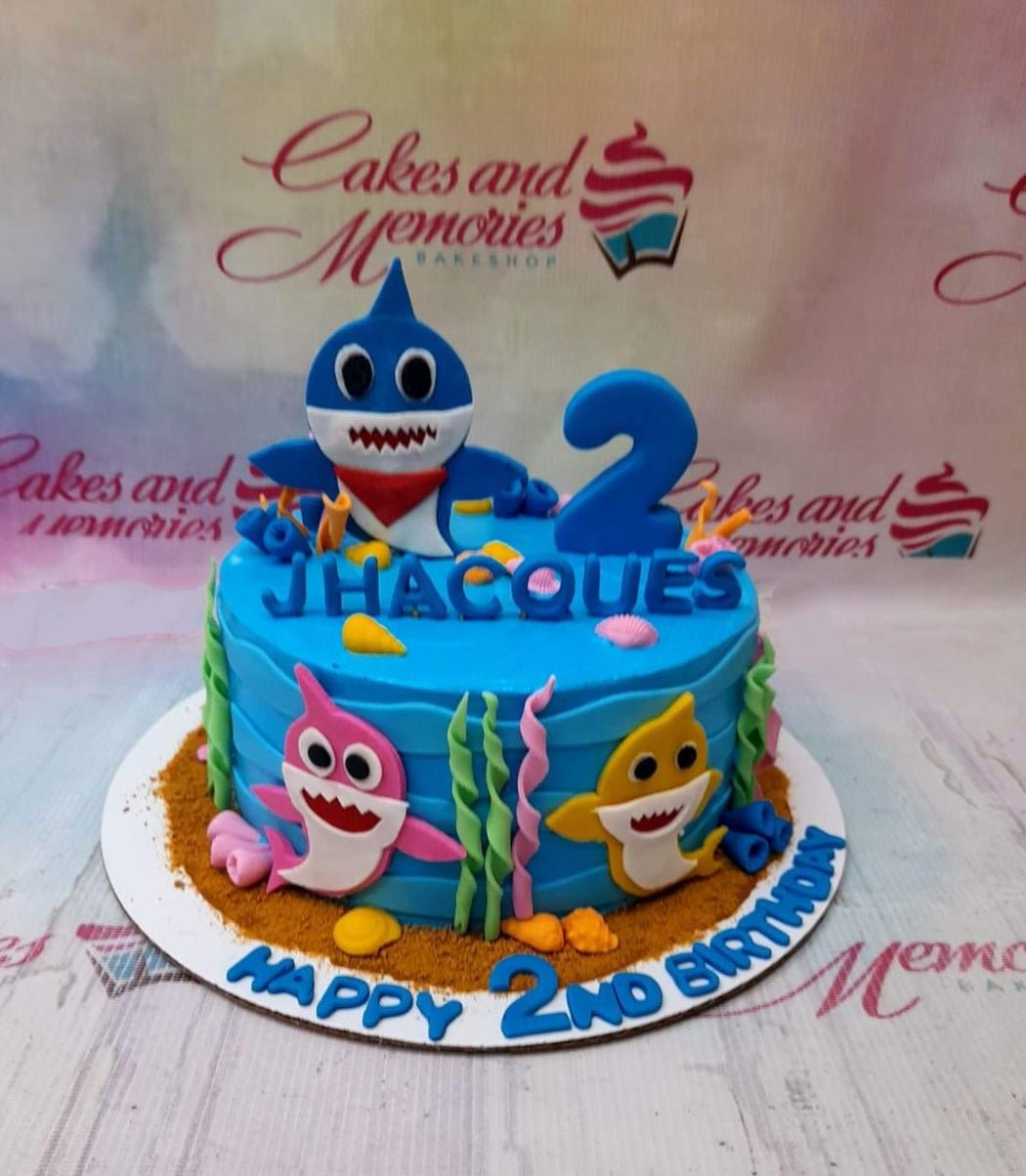 Blue Baby Shark themed birthday cake with fondant shark figures, seaweed, and seashells on a sandy base.