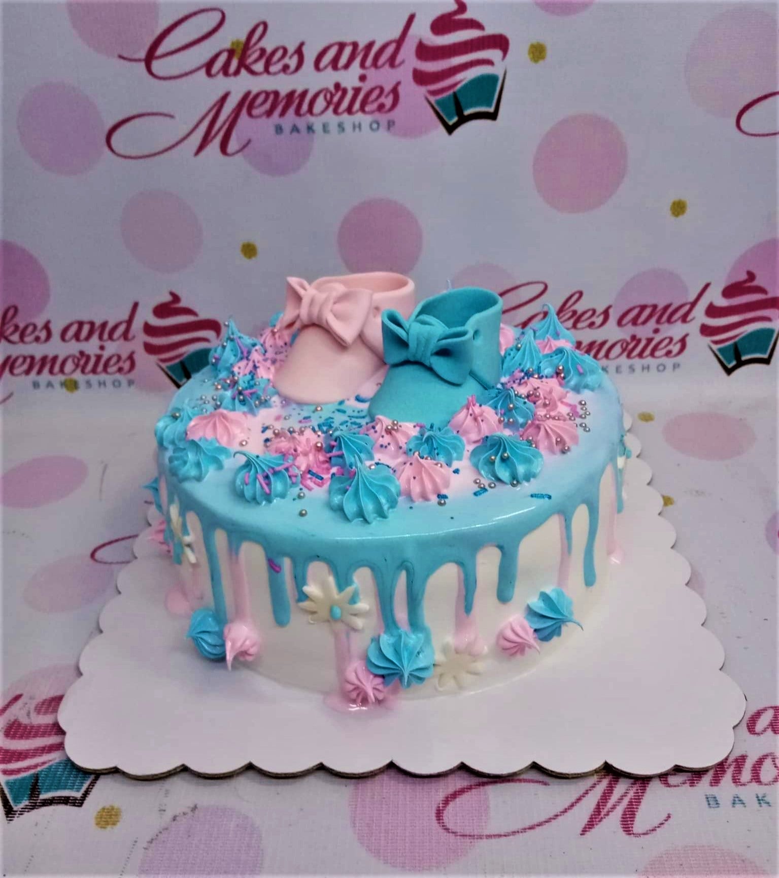 Blue and pink baby shower cake with fondant baby shoes, icing rosettes, and silver sprinkles.