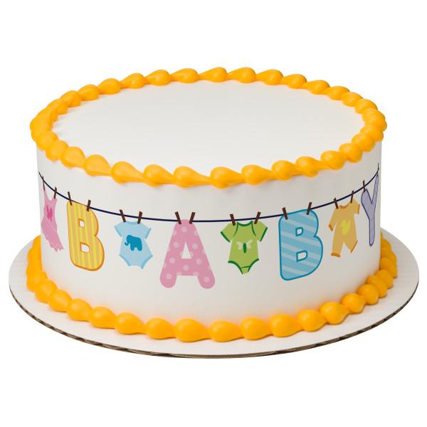 White round baby shower cake with yellow icing borders and a colorful baby clothesline printout design around the side.