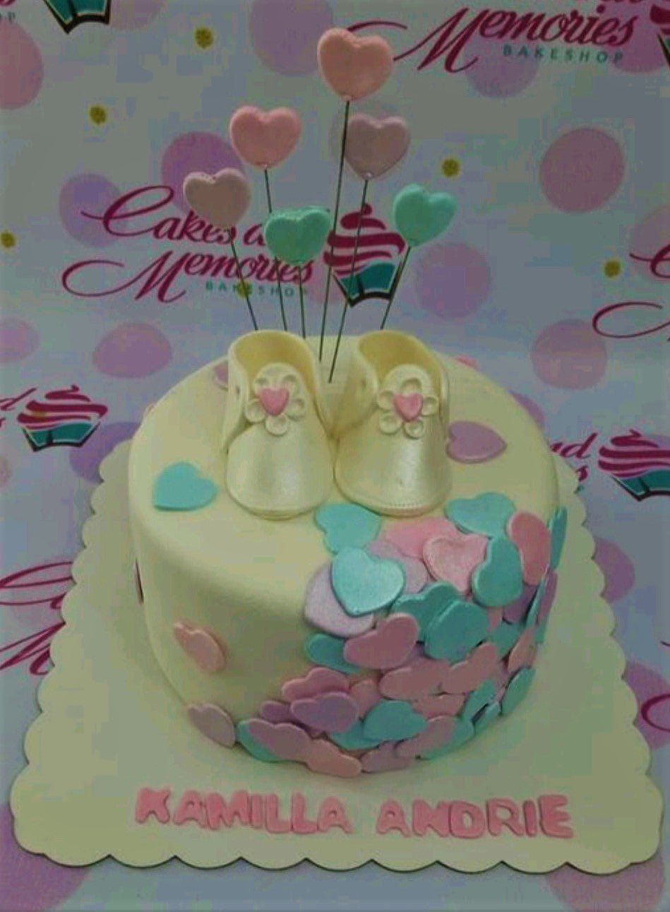 White fondant baby shower cake with pink and teal hearts and edible baby shoes topper.