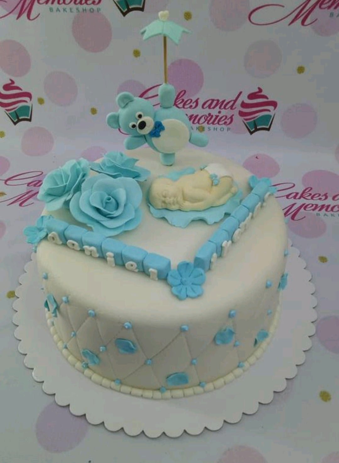 White fondant baby shower cake with a blue teddy bear topper, sleeping baby figure, and blue roses.