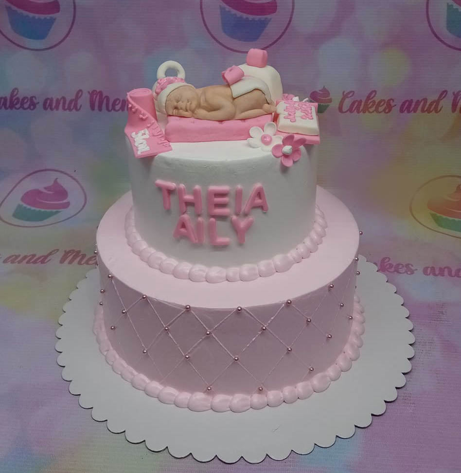 Pink and white 2-tier baby shower cake with a sleeping baby fondant topper, pink quilted pattern, and silver dragees.