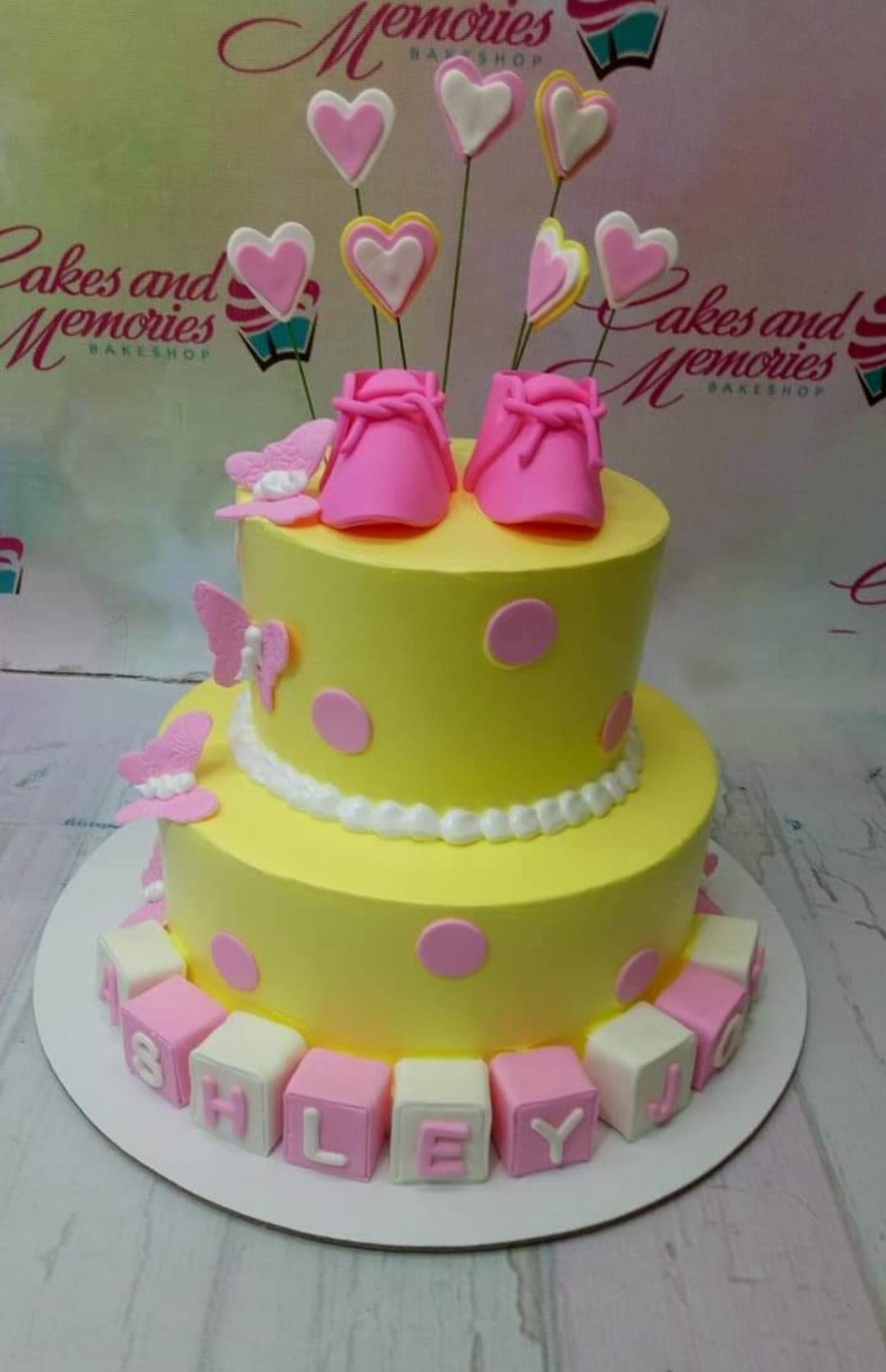 Yellow 2-tier baby shower cake with pink polka dots, pink fondant baby shoes, and heart toppers on sticks.