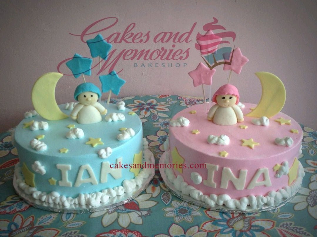 Two matching 1-tier cakes in light blue and pink with fondant baby figures, moons, stars, and clouds.