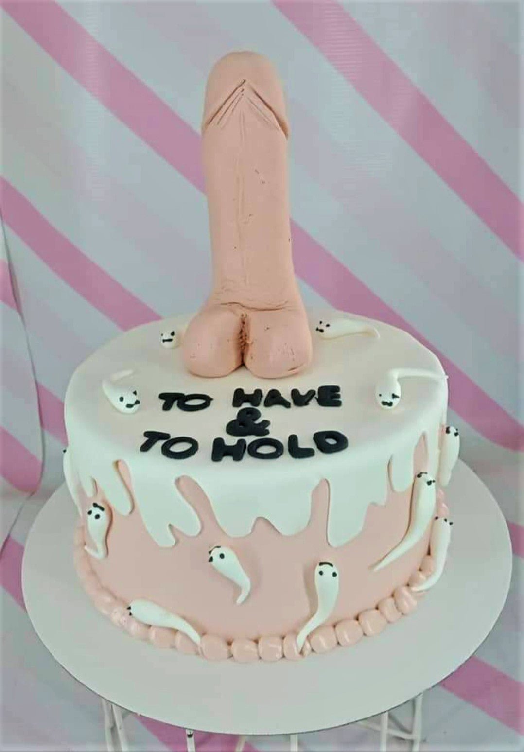 Pink and white bachelorette cake featuring a large flesh-colored phallic topper and white sperm-shaped fondant decorations.
