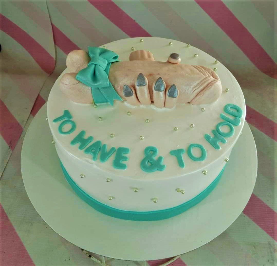 White round cake with a 3D fondant hand holding a phallic shape, teal bow, and silver pearls.