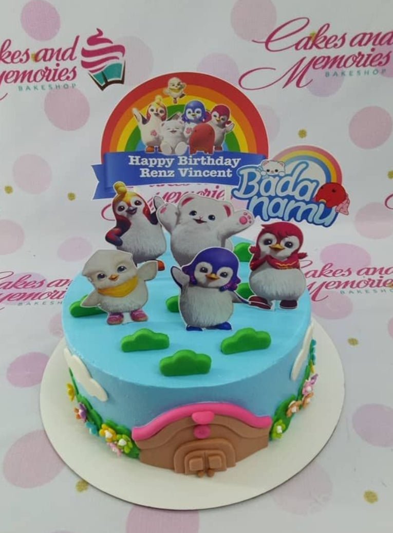 Light blue Badanamu themed birthday cake with character printouts, fondant clouds, and a gumpaste house decoration.