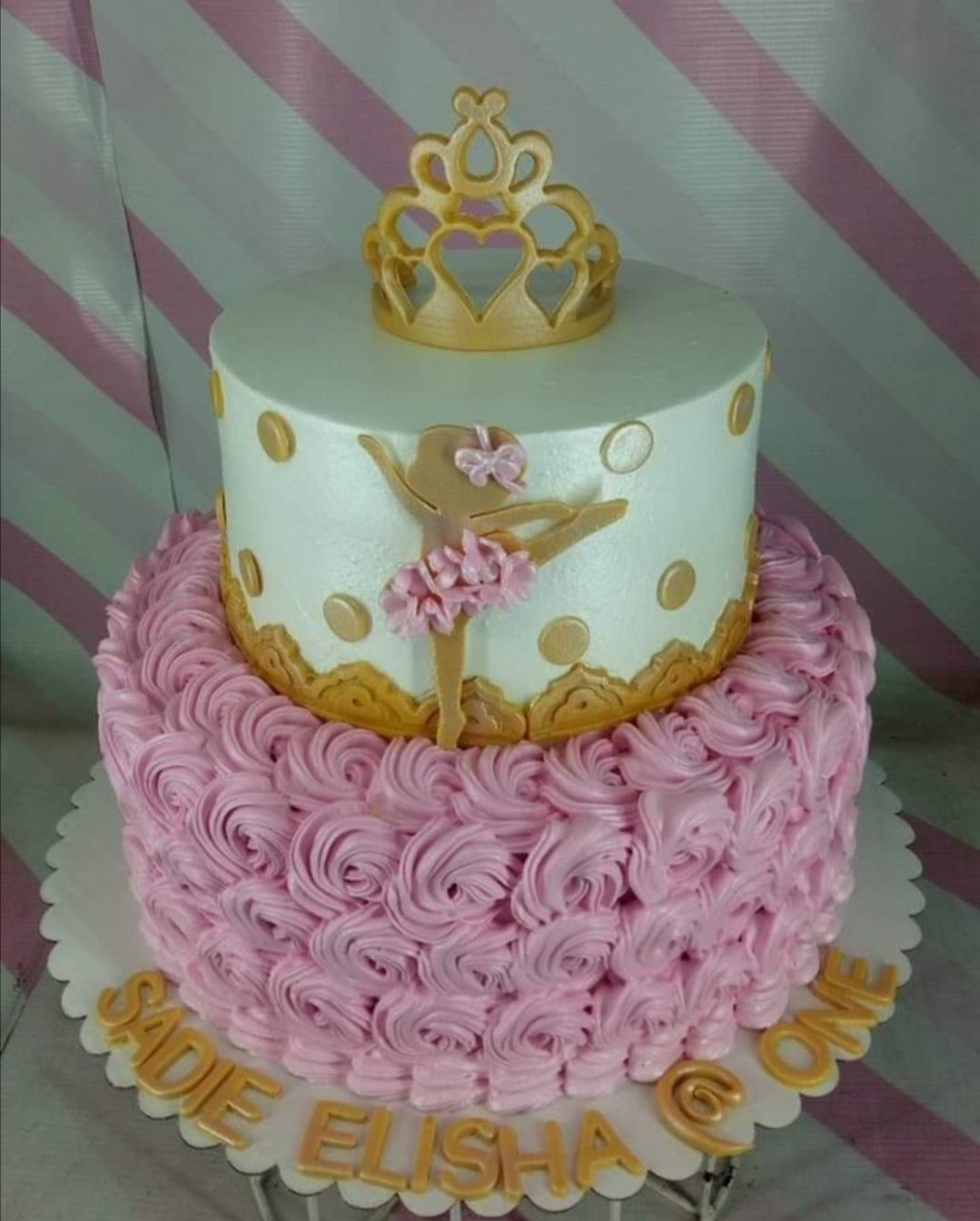Two-tier ballerina birthday cake with pink icing rosettes on the bottom and a white top tier featuring a gold crown and ballerina silhouette.