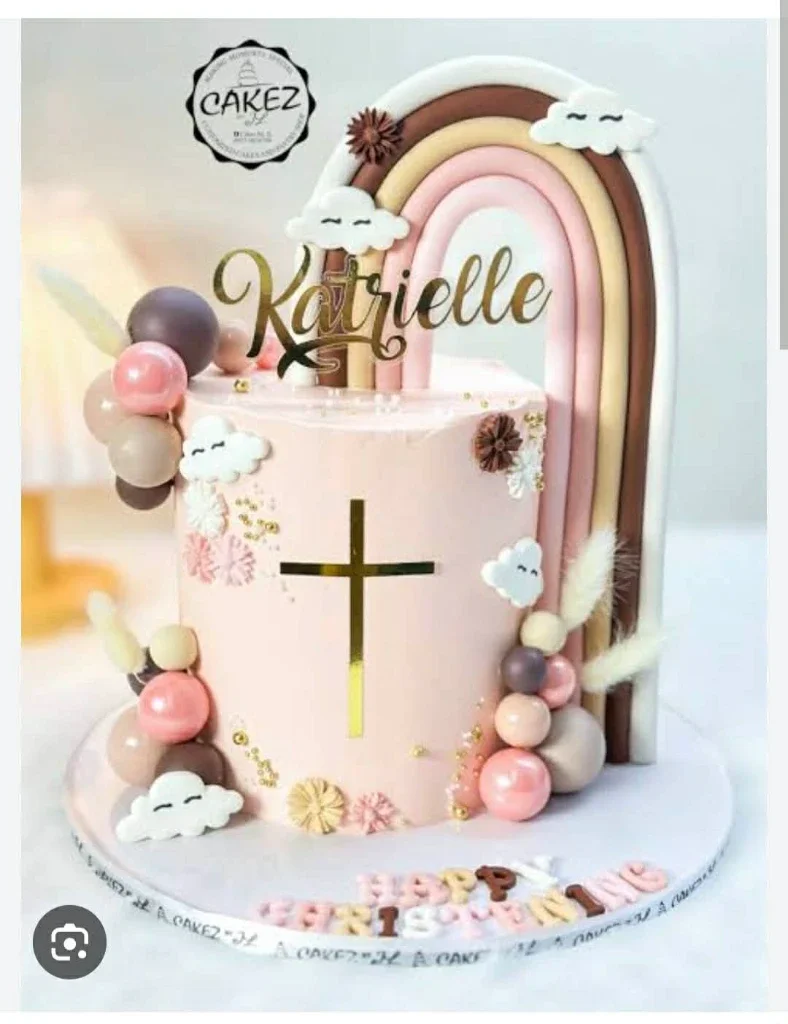 Elegant Pink Baptism Cake With Rainbow Cake Design