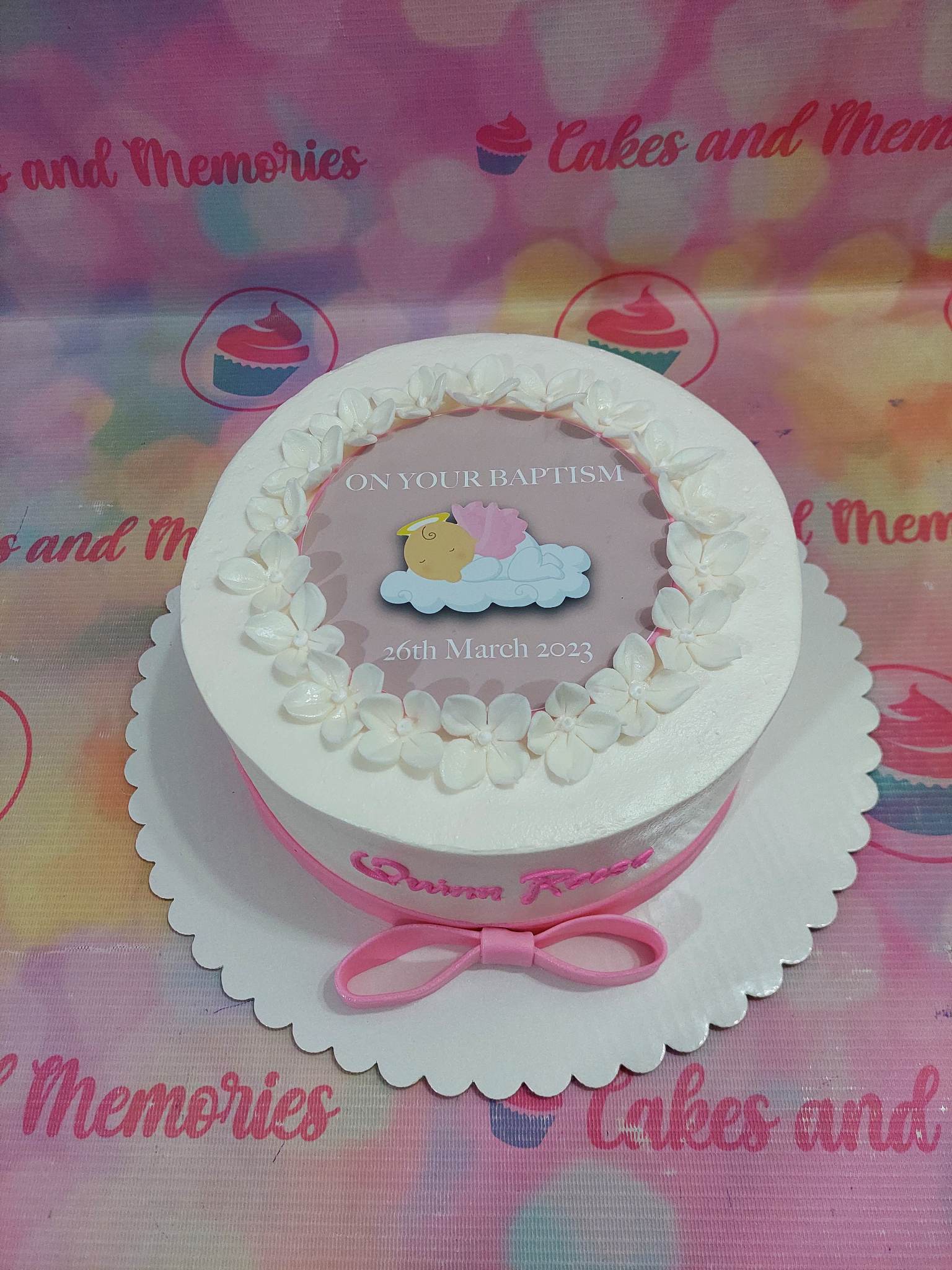 White baptism cake with a pink sleeping baby printout topper, white icing flowers, and a pink fondant bow.