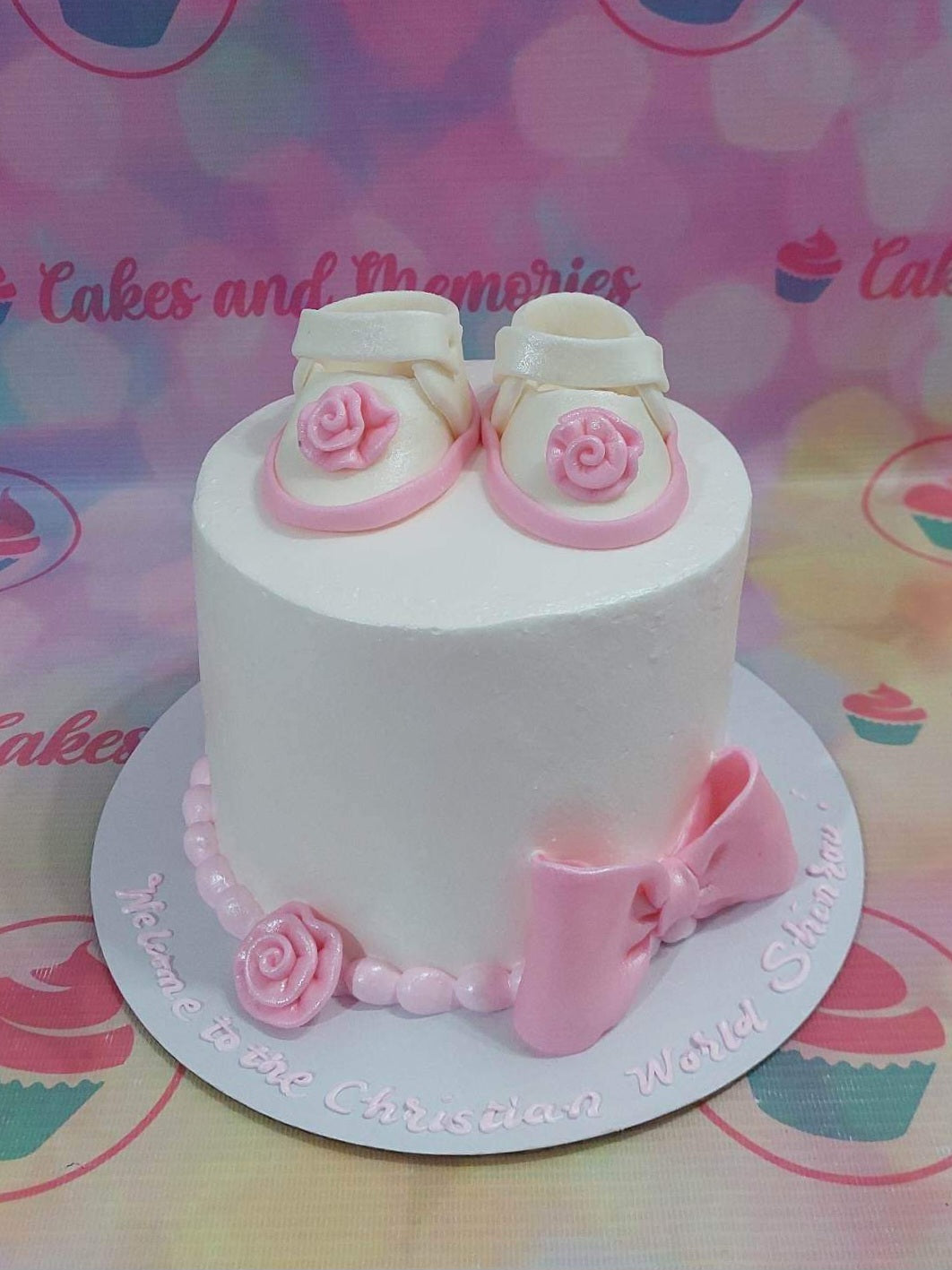 White minimalist cake with pink fondant baby shoes, a pink bow, and a rose for a Christian baptism celebration.
