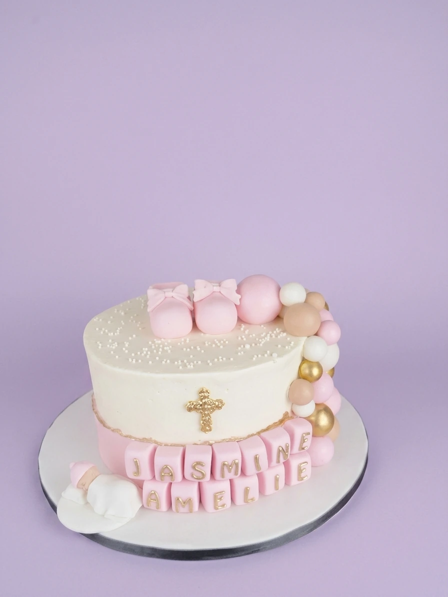 White and pink baptism cake with a gold cross, pink baby shoes, and a sleeping baby figurine on the base.