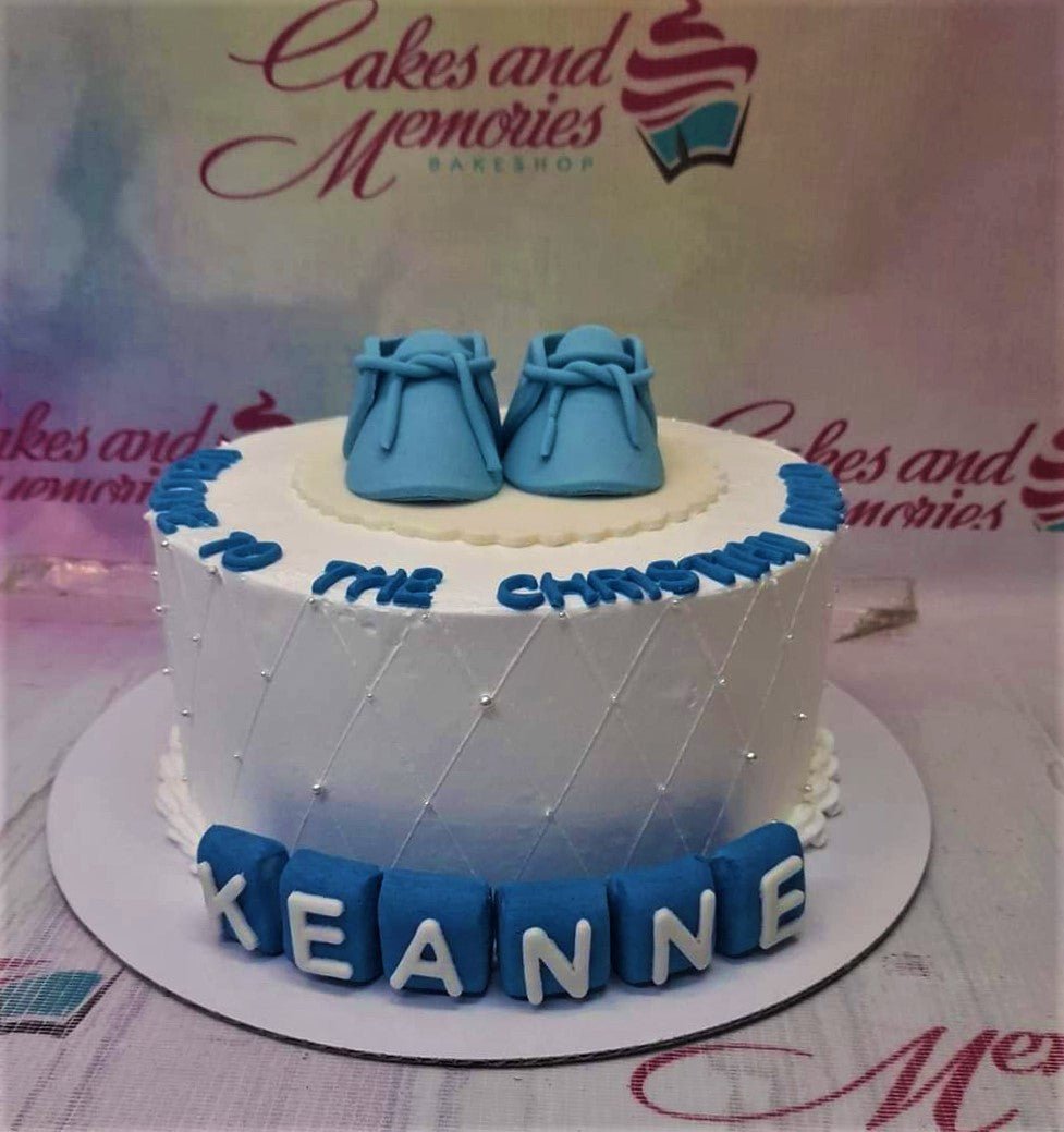 White round baptism cake with blue fondant baby shoes, quilted icing pattern with silver pearls, and blue block letters for Keane.