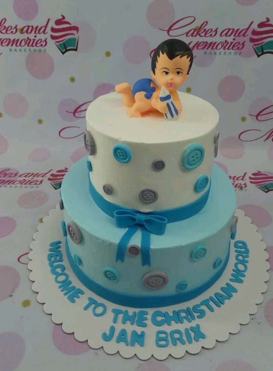 Two-tier light blue and white fondant baptism cake with a 3D baby figure topper and colorful button decorations.
