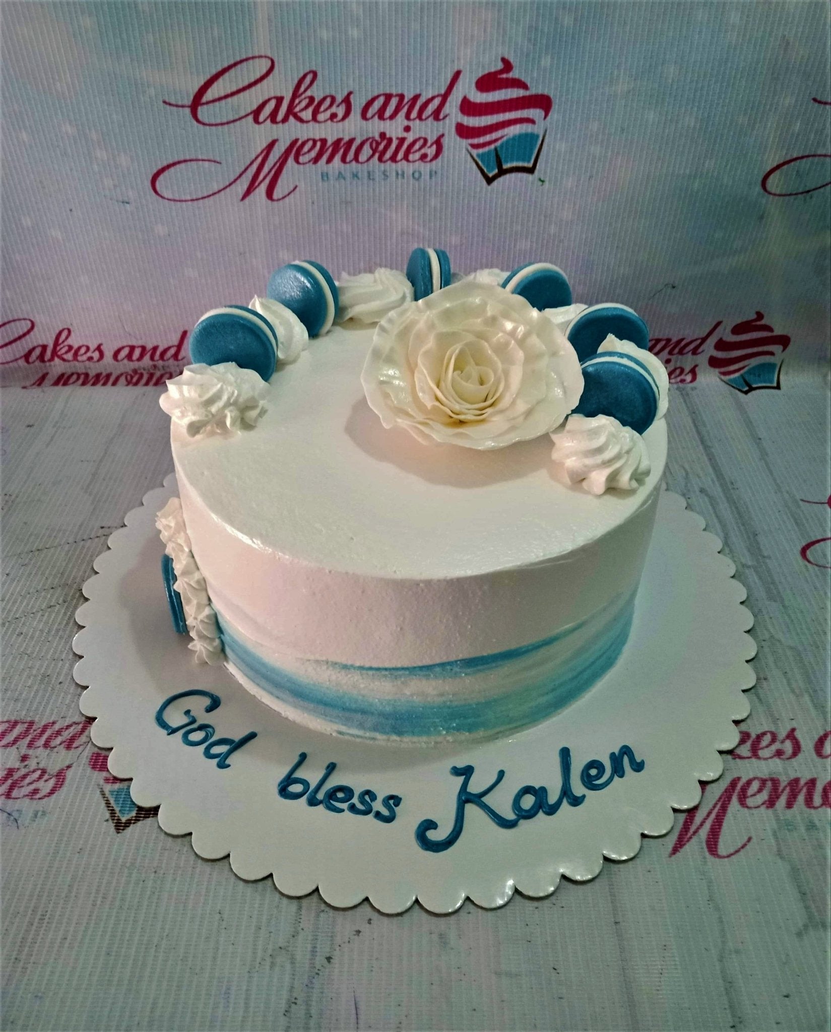 White round cake with blue gradient base, topped with a large white gumpaste rose and blue macarons.