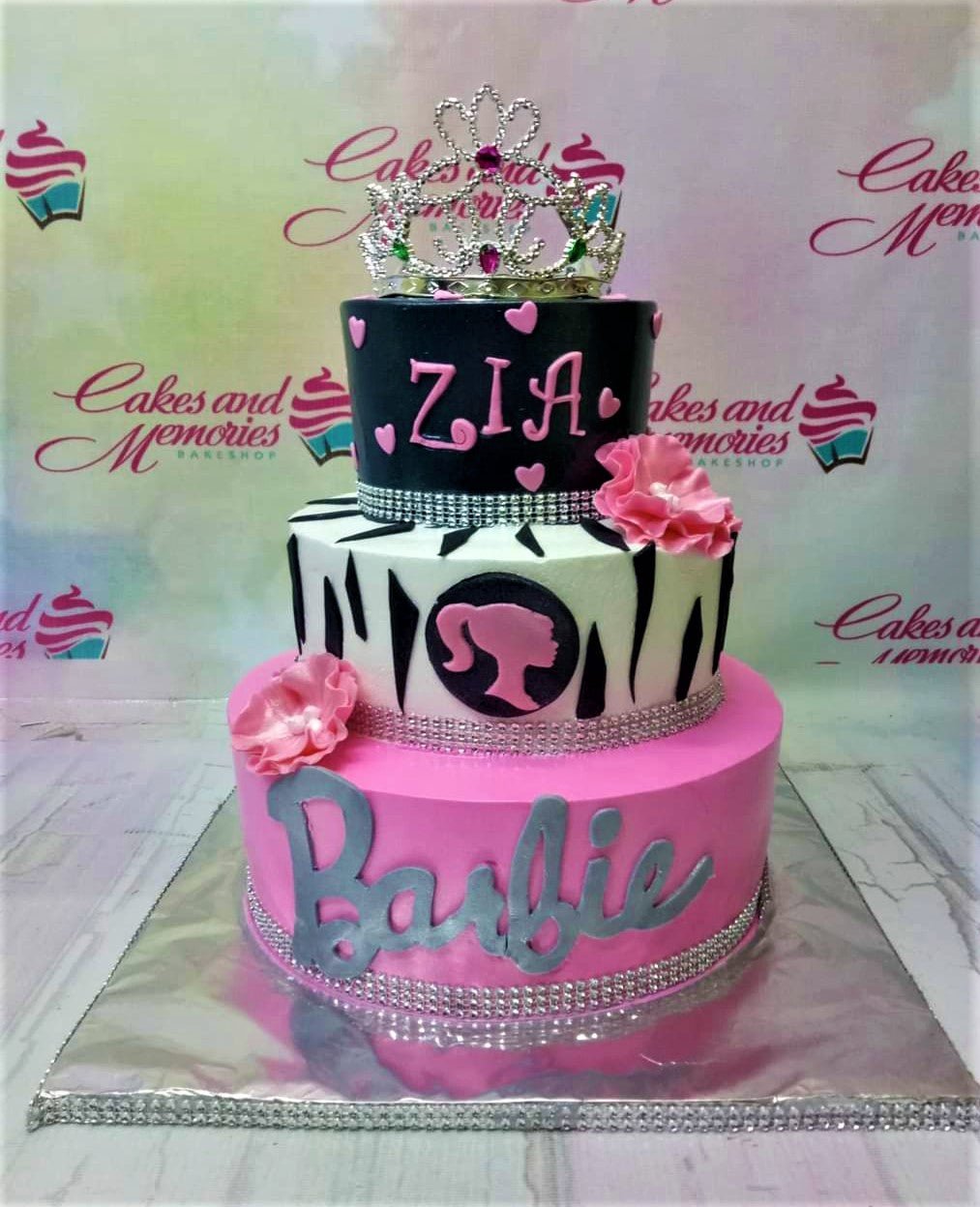 3-tier Barbie themed cake in pink, white, and black with a silver tiara topper and zebra print accents.
