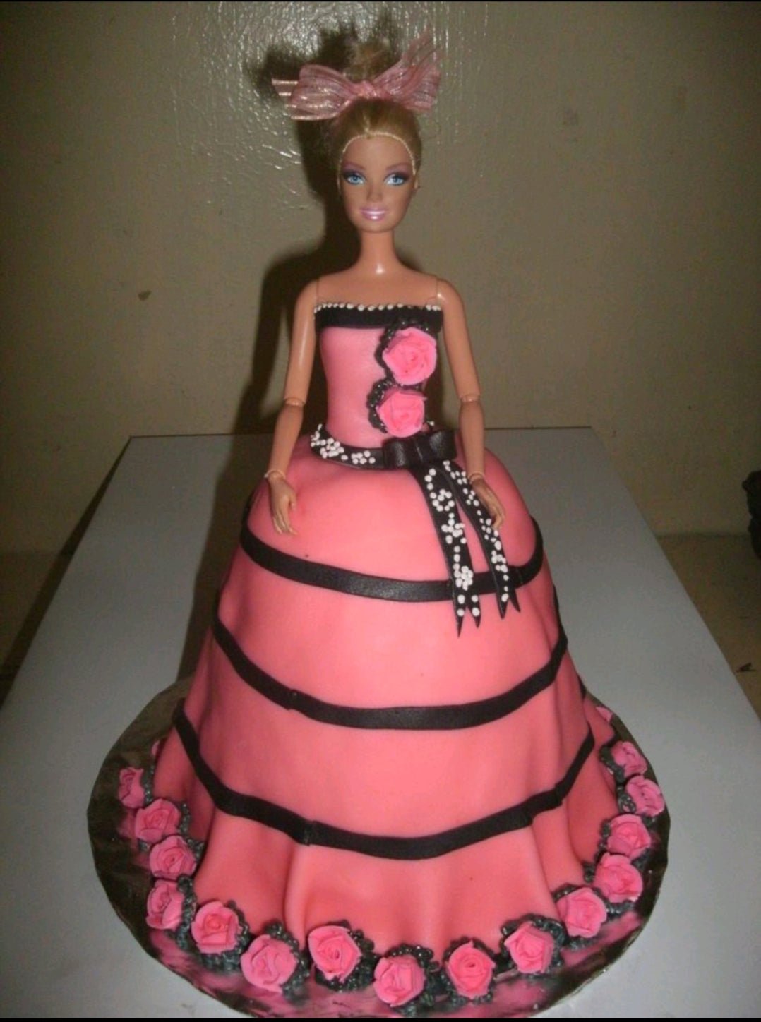 Pink Barbie doll cake with a full fondant ball gown dress decorated with black ribbons and pink roses.