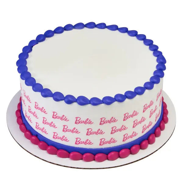 White round cake with purple and pink icing borders and pink Barbie logo text on the sides.
