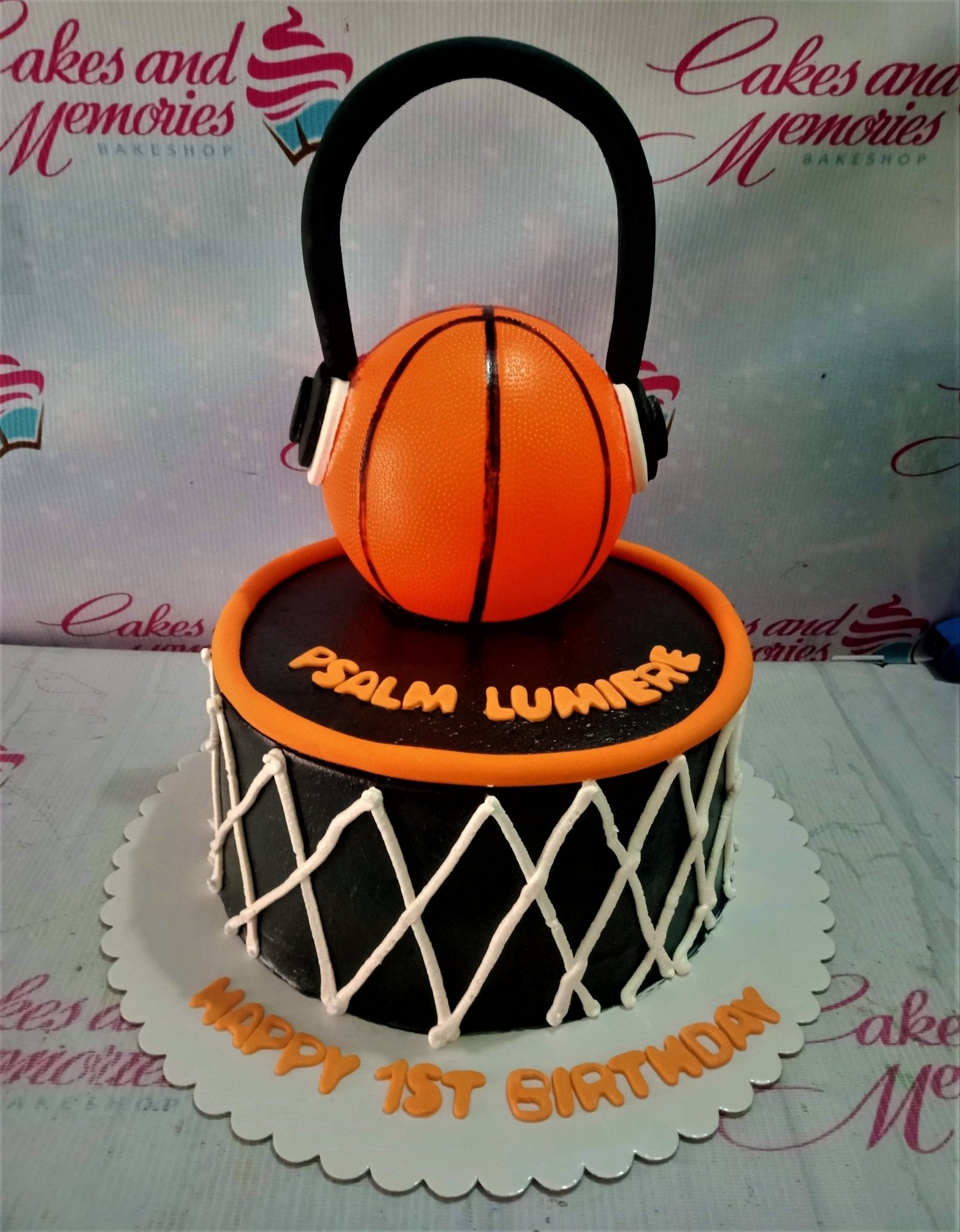 Black basketball themed cake with a large 3D basketball topper wearing headphones and white net icing design on the sides.
