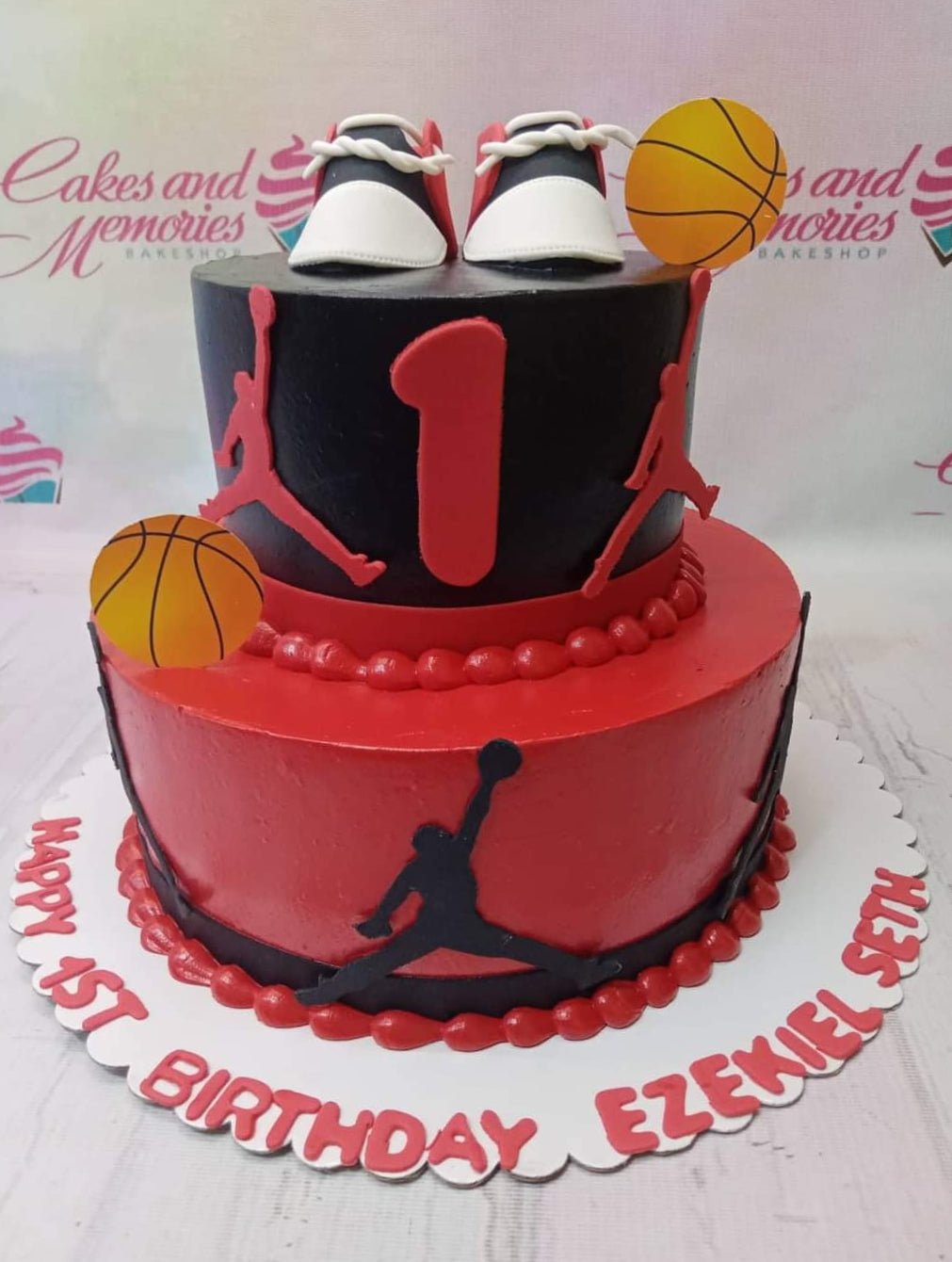 Two-tier basketball themed birthday cake in red and black with Jordan silhouettes, fondant sneakers, and basketball toppers.