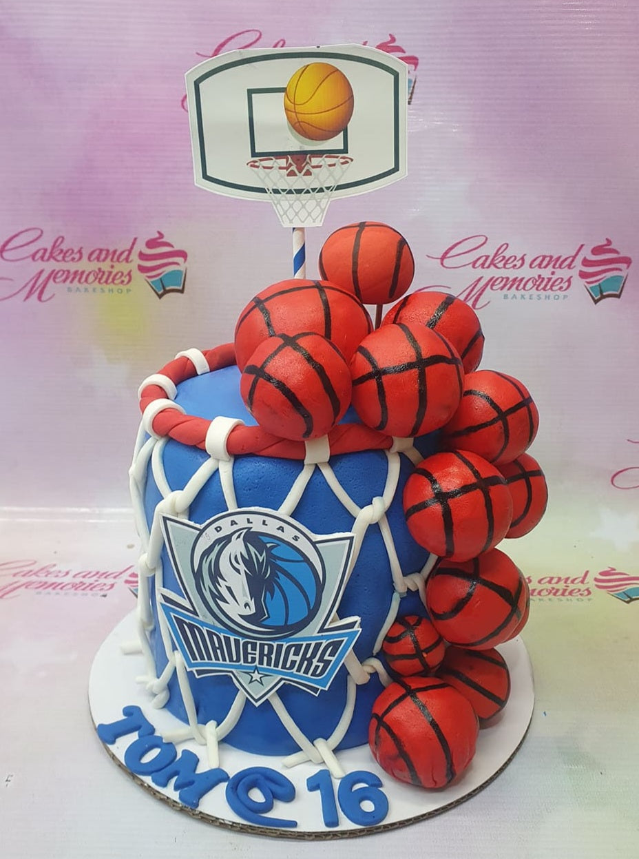 Blue basketball themed cake featuring a Dallas Mavericks logo, a basketball hoop topper, and numerous 3D fondant basketballs.