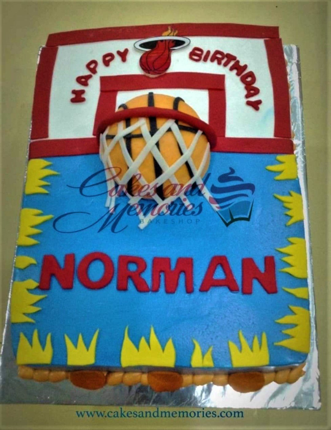 Miami Heat basketball themed rectangle cake with a 3D basketball hoop and ball, yellow flames, and red lettering.