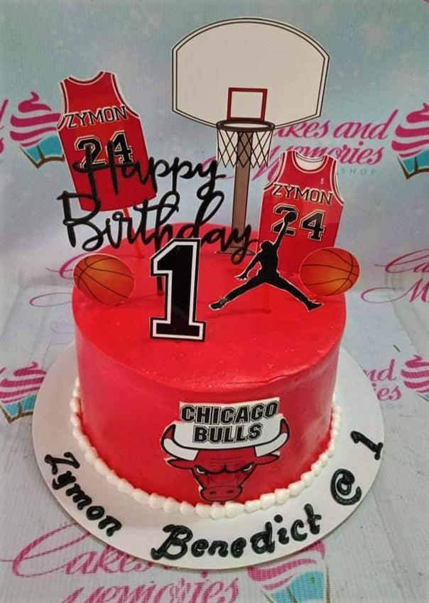 Red Chicago Bulls basketball themed birthday cake with jersey toppers and a basketball hoop for Zymon's 1st birthday.