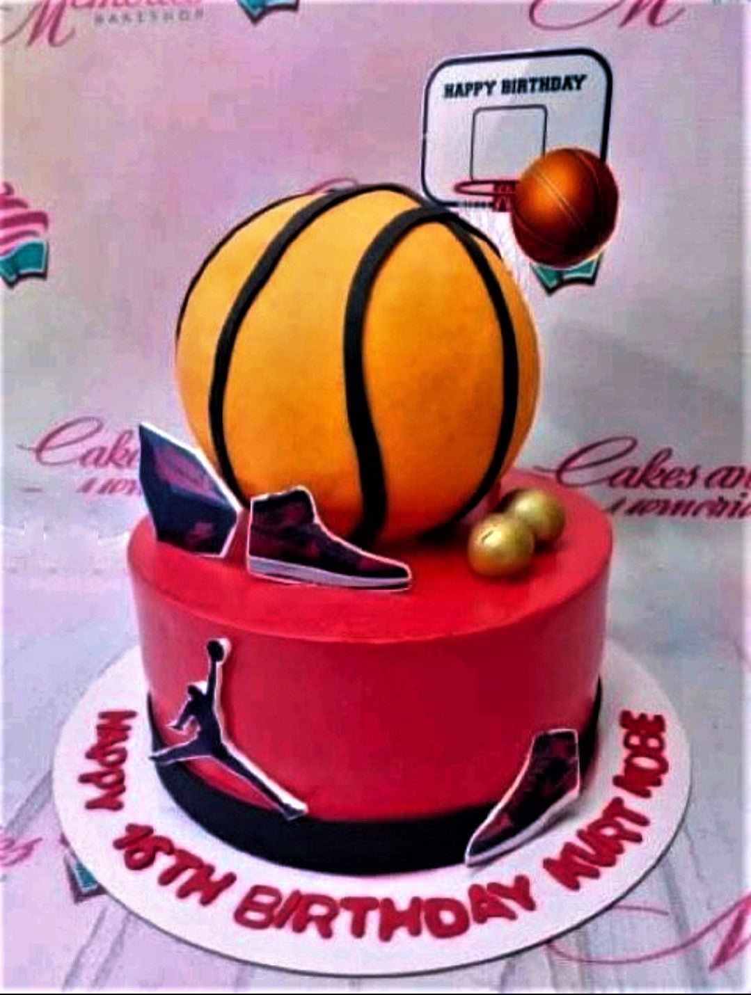 Red basketball themed birthday cake with a large 3D basketball topper, Jordan logo, and sneaker printouts.