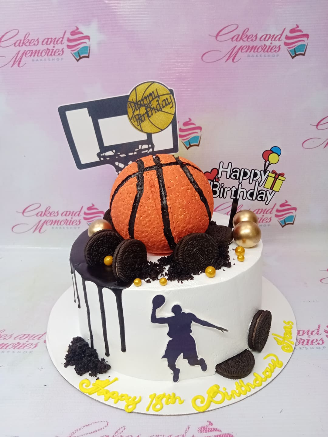 White basketball themed birthday cake with a 3D fondant basketball, chocolate drip, and basketball player silhouette.