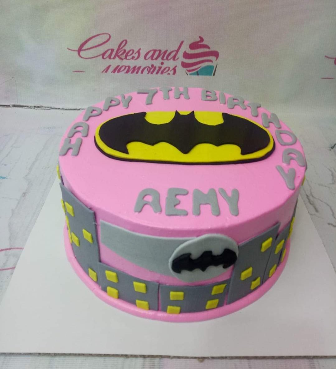 Pink Batman themed birthday cake with a large yellow and black Batman logo on top and a city skyline gumpaste panel around the side.
