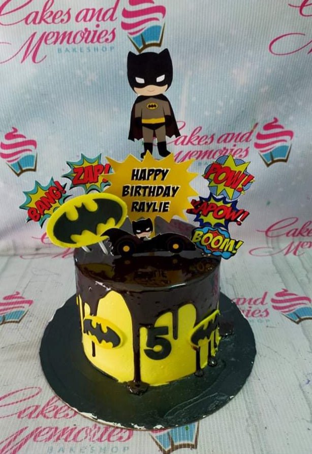 Batman themed birthday cake with yellow icing, chocolate drip, and various Batman character and comic book action word printouts.