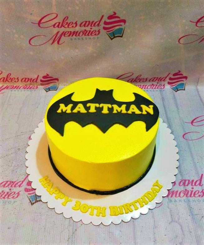 Yellow Batman themed birthday cake with a black bat logo and personalized Mattman name on top.