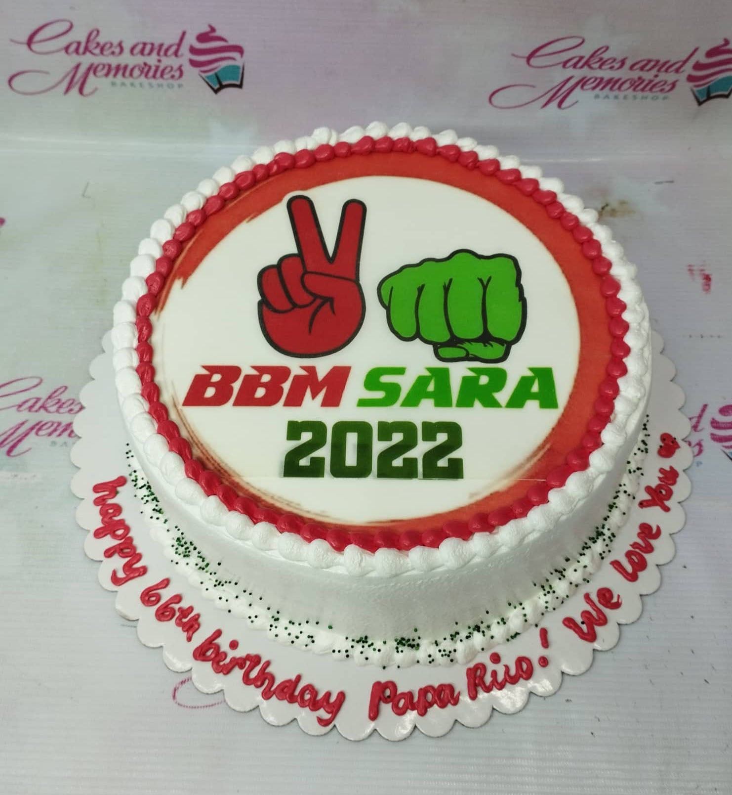 White round cake with a BBM Sara 2022 political campaign logo printout and red and white icing borders.