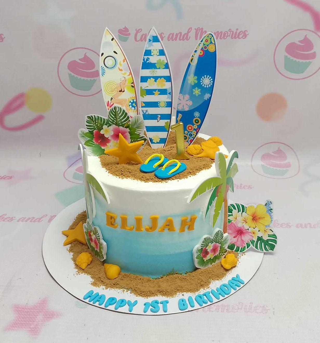 Beach themed birthday cake with surfboards, palm trees, and sand for Elijah's 1st birthday.