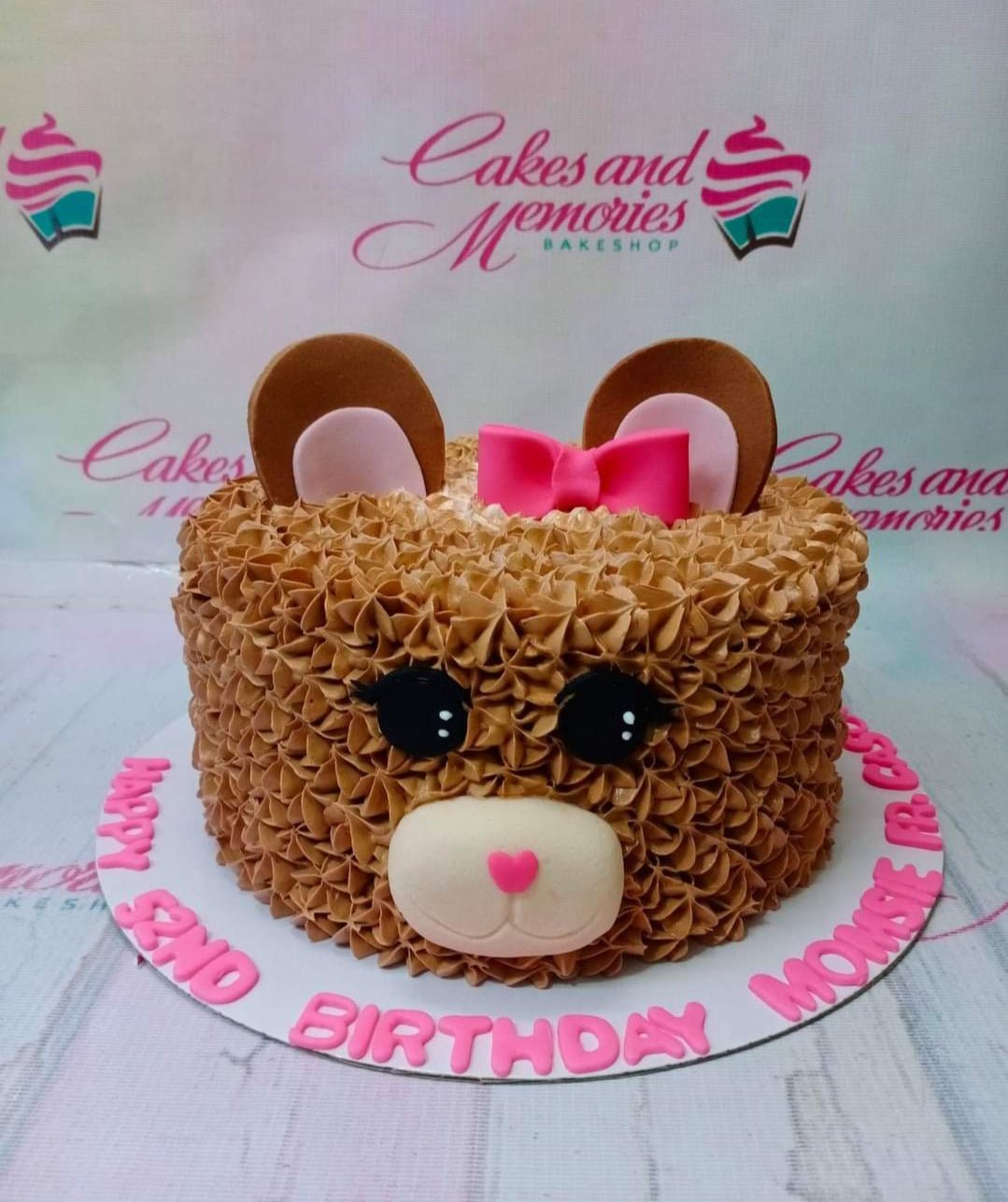 Brown bear-themed birthday cake with piped icing fur, fondant ears, a pink bow, and a personalized message on the base board.