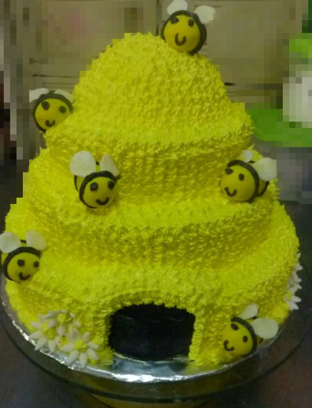 Yellow beehive-shaped 3-tier cake with piped icing texture and edible fondant bees and white flowers.
