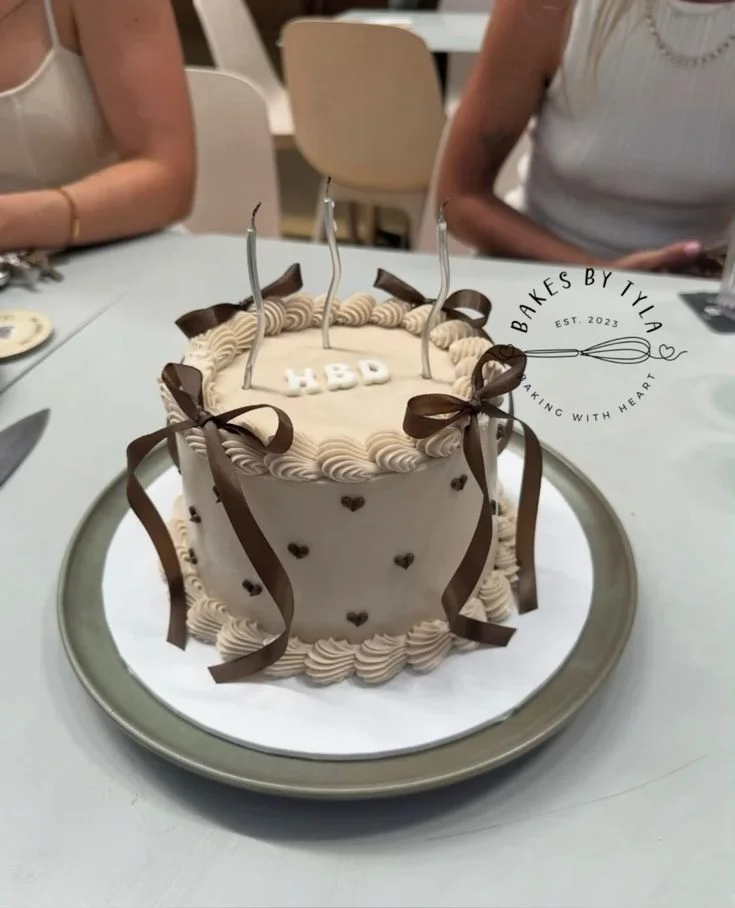 Minimalist beige vintage cake with brown satin bows, piped cream borders, and small brown icing hearts.