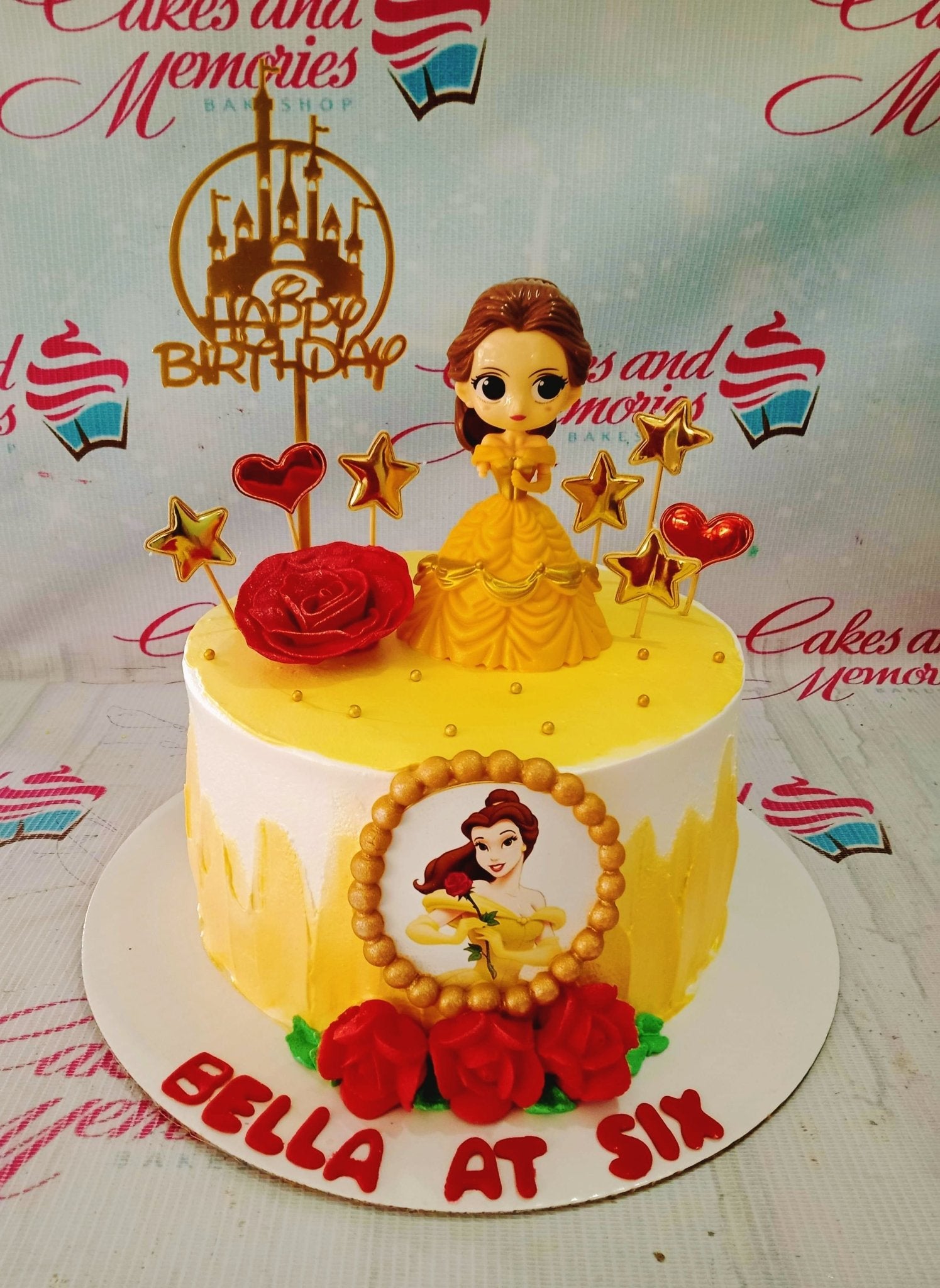 Belle Beauty and the Beast themed cake with a yellow and white icing base, a 3D Belle figure, and red rose decorations.