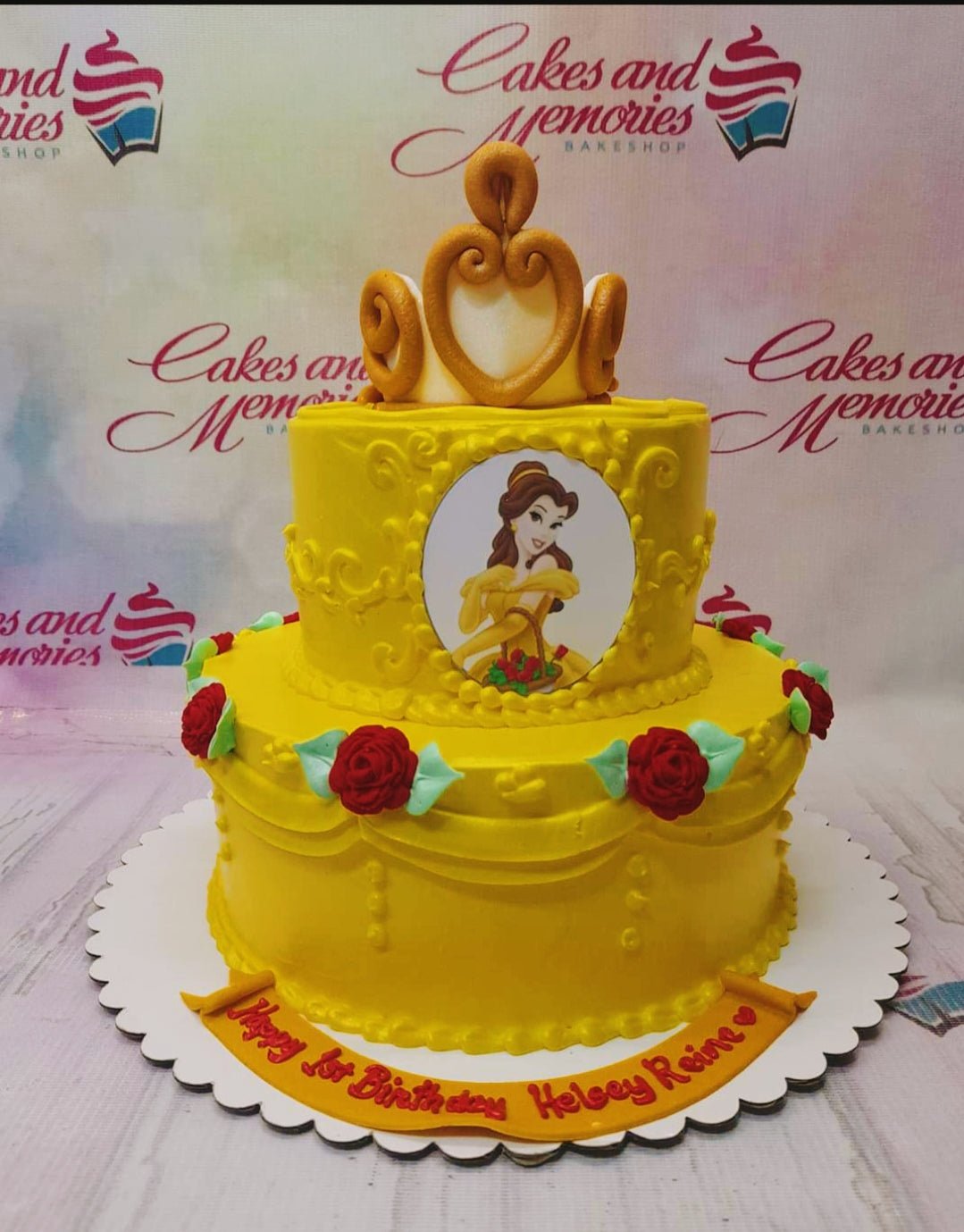 Yellow 2-tier Beauty and the Beast themed cake with Belle printout, gold fondant crown, and red icing roses.