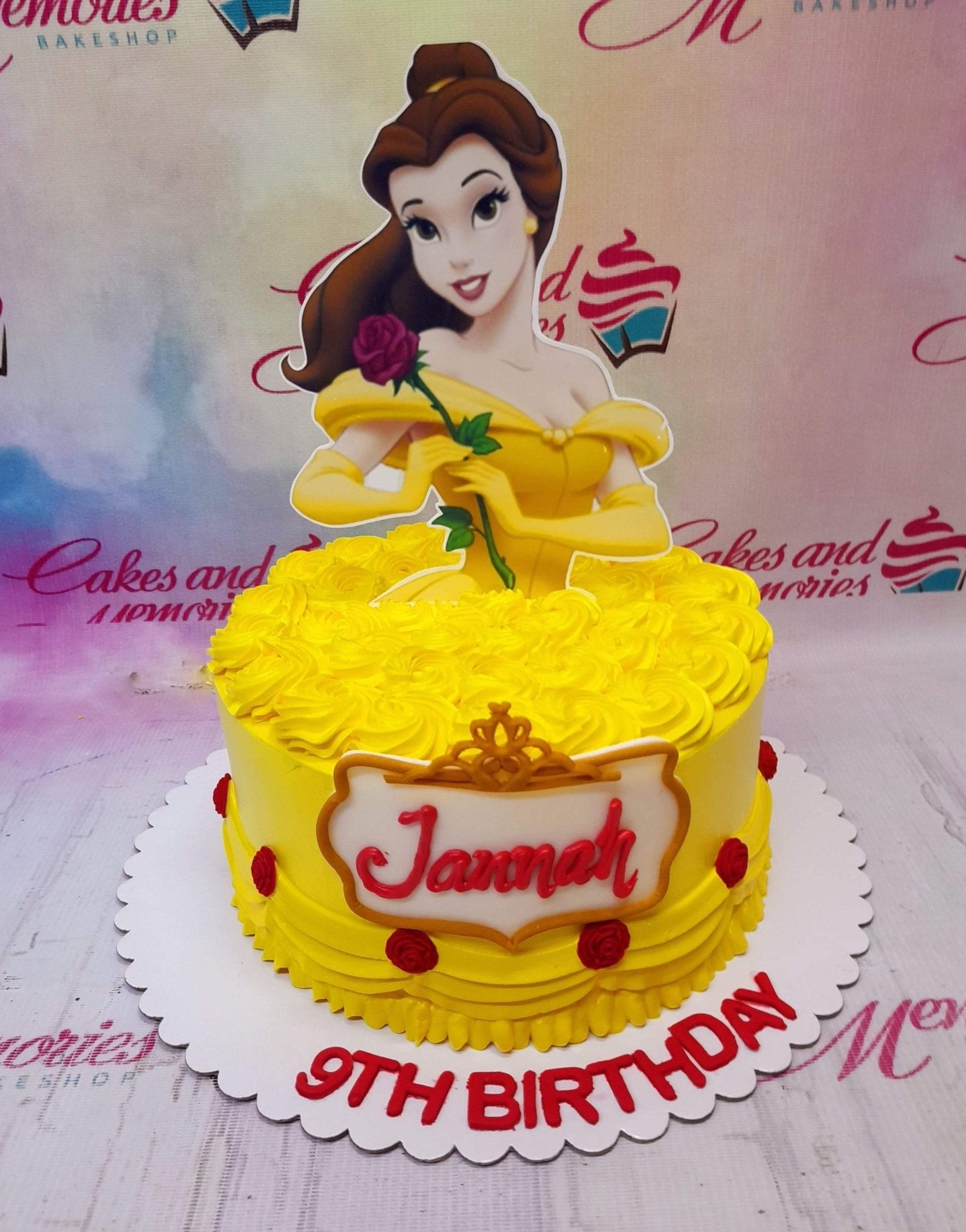 Yellow Belle Disney Princess birthday cake with piped icing rosettes and a large character printout topper.